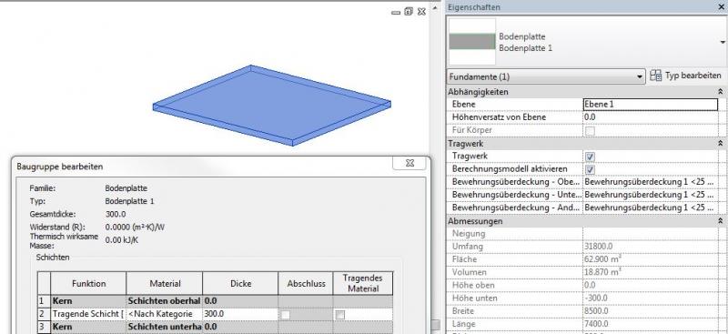 Plattenfundamente werden mit dem Befehl >Ingenieurbau >Fundament >Platte erstellt und zählen zur Systemfamilie Fundament/Bodenplatte. Die Plattendicke kann über >Typ bearbeiten eingestellt werden. Plattenfundamente ähneln sich hinsichtlich der Erstellung von Geschossdecken, unterscheiden sich jedoch hinsichtlich deren statischer Berechnung.