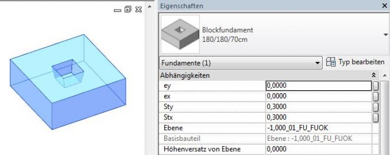 Einzelfundamente werden mit dem Befehl >Ingenieurbau >Fundament >Einzeln oder alternativ mit >Architektur >Bauteil erstellt und zählen zu den externen Familien, die vor der Platzierung aus dem Revit-Content in das Projekt geladen werden müssen. Für neue Fundament-Familien kann die Familien-Vorlage >M_Fundament herangezogen werden. Die Einstellung der Größe des Fundaments erfolgt über >Typ bearbeiten und die entsprechenden Typenparameter: