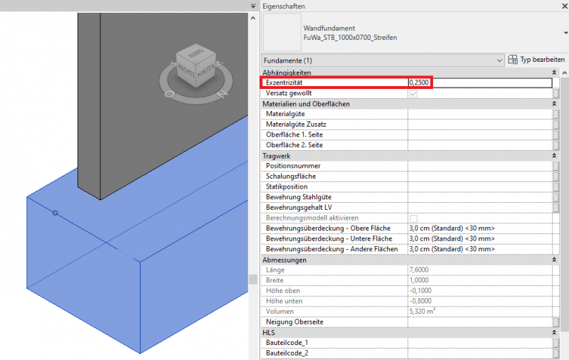 Wenn das Wandfundament bzw. Streifenfundament nicht zentral, sondern asymmetrisch unter einer Wand platziert werden soll (seitlicher Fundament-überstand unterschiedlich), wird dafür der Parameter >Exzentrizität im Eigenschaftenfenster entsprechend eingestellt. In diesem Zusammenhang wird empfohlen, die entsprechende Kante der Wand als Basislinie zu verwenden: