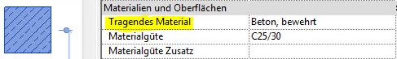 In Revit werden die spezifischen farbigen Darstellungen für Einreichpläne (Genehmigungspläne) im Material definiert (eine Typ-Einstellung für die Farbfüllung im groben Maßstab ist bei den Tragwerksstützen nicht vorhanden):Farbe im Material:Weitere Merkmale werden wie weiter oben beschrieben in die Eigenschaften des Bauteils eingetragen (Parameter), um für Beschriftungen verwendet werden zu können: