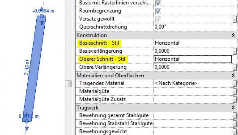 Mit folgenden Maßnahmen können Stützen-Enden schräg abgeschnitten werden: