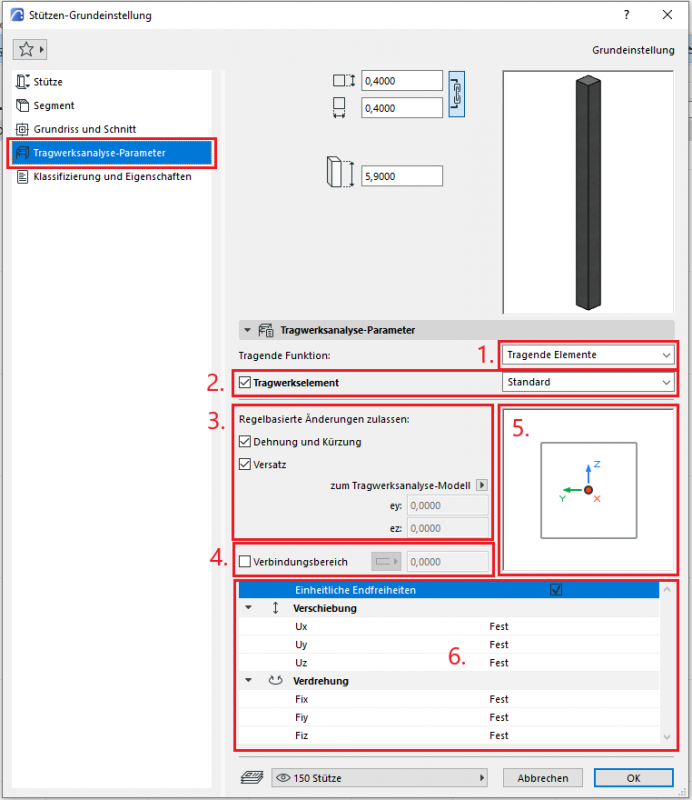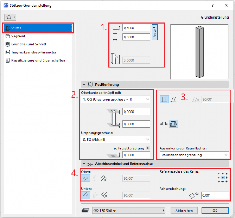 Die 2. Grundeinstellung definiert die Tragstruktur und Abmessungen einer Stütze: