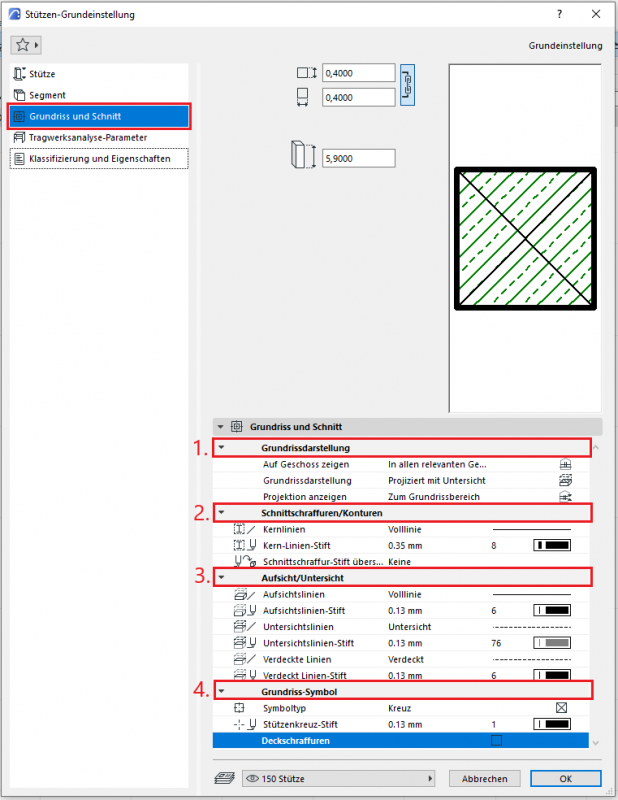 Schnittschraffuren und Konturen unter Punkt 2. sollten nicht in individuelle Stützeneinstellungen überschrieben werden – dies sollte immer zentral im Profil übergreifend für alle Bauelemente eingestellt werden, oder es wird für spezielle/temporäre Darstellungsänderungen die Option der Grafischen Überschreibungsstile verwendet.