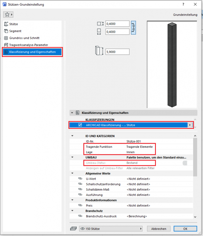 Für Stützen gilt insbesondere, dass unter Kategorien und Eigenschaften die "Tragende Funktion" auf "Tragende Elemente" gestellt wird, und im Komplexen Profil der Baustoff Stahlbeton auf "Kern" gesetzt wird. Durch diese Einstellung wird unter Verwendung der Strukturdarstellung "Nur der Kern der tragenden Elemente" die Darstellung der Stütze ohne ihre weiteren Schichten (z.B. Aufdämmung) lt. Profil ermöglicht. Auch die Stützen-Auswertung greift auf diese Informationen zurück, bzw. kann diese (und alle anderen der Stütze zugewiesenen) wiedergeben.