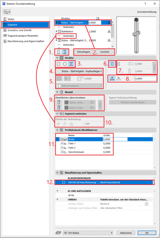 - In dem letzten Reiter kann man die einzelnen Segmente klassifizieren und deren Eigenschaften festlegen. Die Struktur der Klassifizierungssysteme der Stütze ist hierarchisch, die Stütze ist übergeordnet und die Segmente sind untergeordnet.