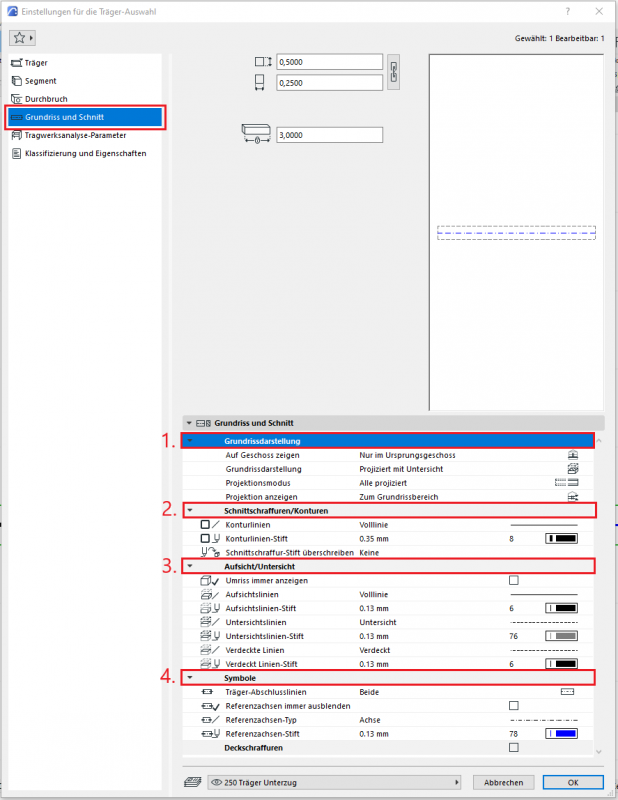 Schnittschraffuren und Konturen unter Punkt 2. sollten nicht in individuellen Unterzugeinstellungen überschrieben werden, dies sollte immer zentral im Profil übergreifend für alle Bauelemente eingestellt werden, oder es wird für spezielle/temporäre Darstellungsänderungen die Option der Grafischen Überschreibungsstile verwendet.