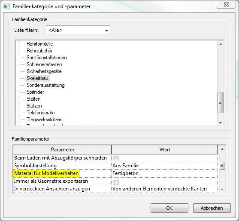 Eine Material-Zuweisung erfolgt bei Trägern in 2 Schritten:- Material-Zuordnung für die Statische Berechnung: Erfolgt über die Auswahl des Familien-Parameters >Material für Modellverhalten in der Familie (hier am Beispiel eines Fertigbeton-Trägers):
