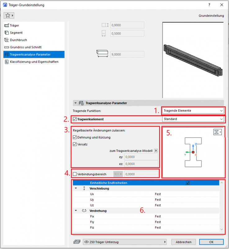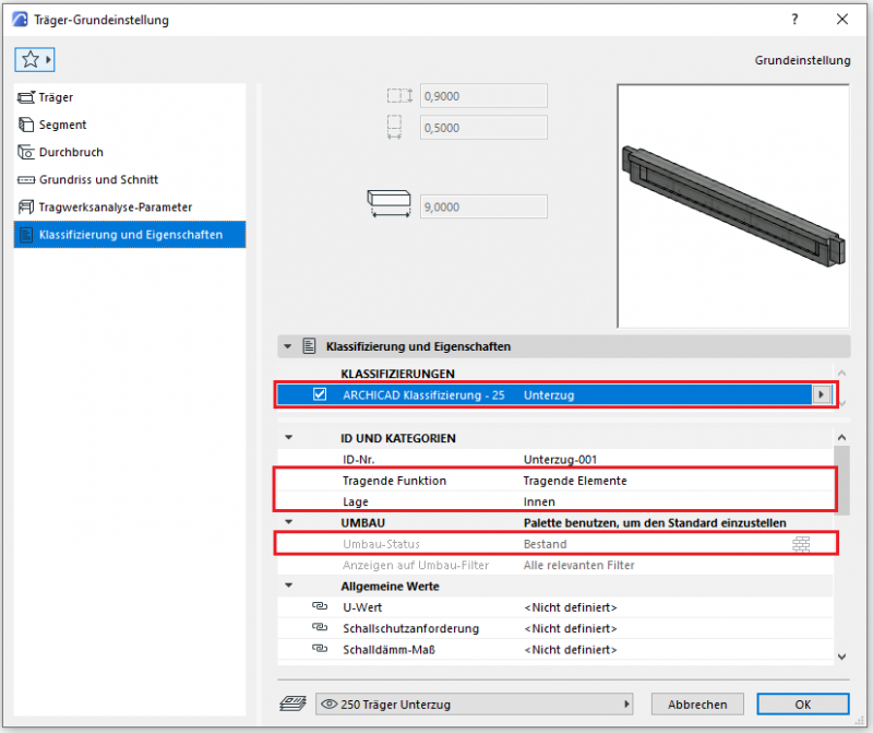 Für Träger/Unterzüge gilt insbesondere, dass unter Kategorien und Eigenschaften die "Tragende Funktion" auf "Tragende Elemente" gestellt wird, und im Komplexen Profil der Baustoff Stahlbeton auf "Kern" gesetzt wird. Durch diese Einstellung wird unter Verwendung der Strukturdarstellung "Nur der Kern der tragenden Elemente" die Darstellung des Trägers/Unterzugs ohne seine weiteren Schichten (z.B. Aufdämmung) lt. Profil ermöglicht. Auch die Träger/Unterzug-Auswertung greift auf diese Informationen zurück, bzw. kann diese (und alle anderen dem Träger/Unterzug zugewiesenen) wiedergeben.