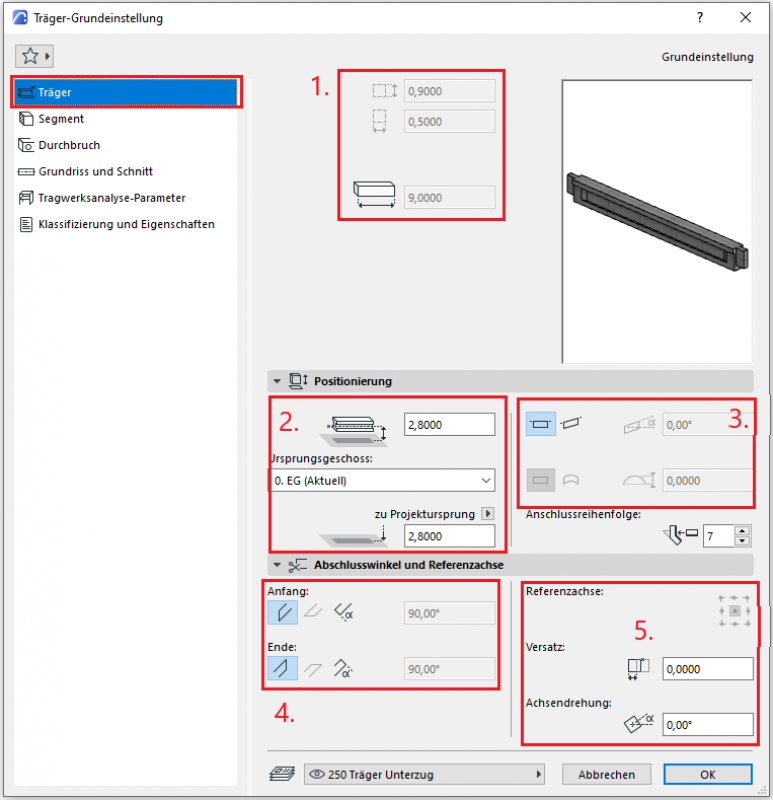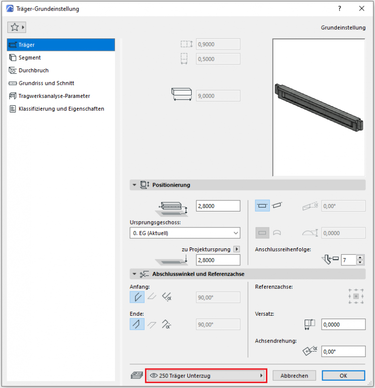 Die 2. Grundeinstellung in Positionierung betrifft die Positionierung des Unterzugs im Bezug zum Geschoss.