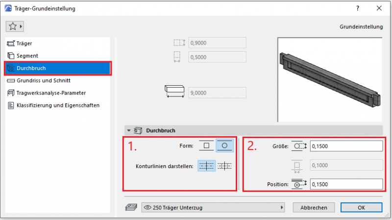Anmerkung: Der Durchbruch wird nur im Grundrissbereich sichtbar, wenn die Grundrissdarstellung des Trägers auf „Symbolisch“ gestellt ist.