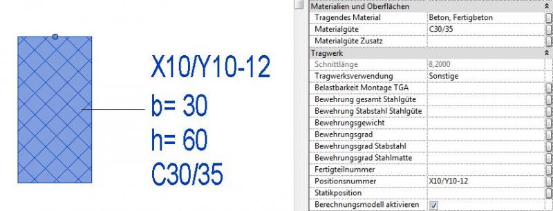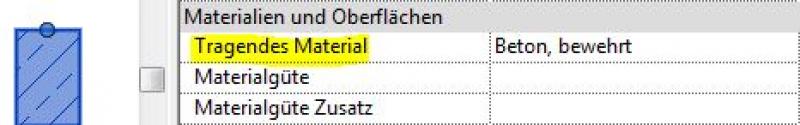 Material-Zuordnung für die grafische Darstellung: Erfolgt über die Auswahl im Exemplarparameter >Tragendes Material im Projekt (hier am Beispiel einer Stahlbeton-Trägers):