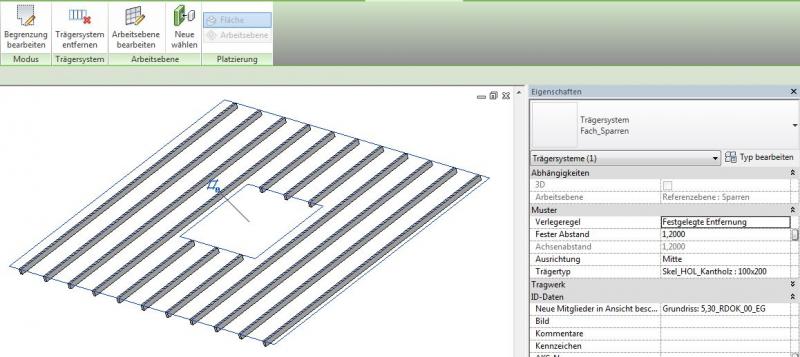 - Trägersystem: Der Befehl >Ingenierbau >Trägersystem dient der Erstellung einer Reihe von parallelen Trägern, wie beispielsweise Sparrenlagen in einem Steildach. Vorteil bei der Verwendung dieses Befehls ist die Möglichkeit, System-Unterbrechungen wie bspw. im Bereich von Öffnungen, hocheffizient mit einfachen Begrenzungslinien durchführen zu können. Die im System zu verwendende Trager-Familie/-Typ kann im Eigenschaftenfenster unter >Trägertyp eingestellt werden: