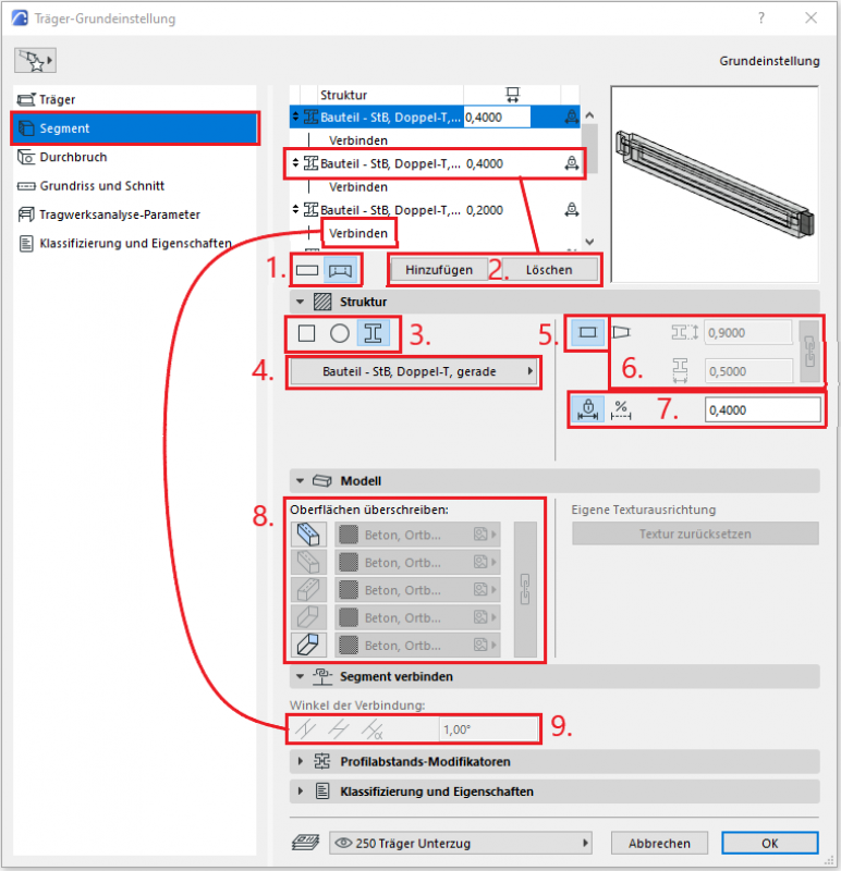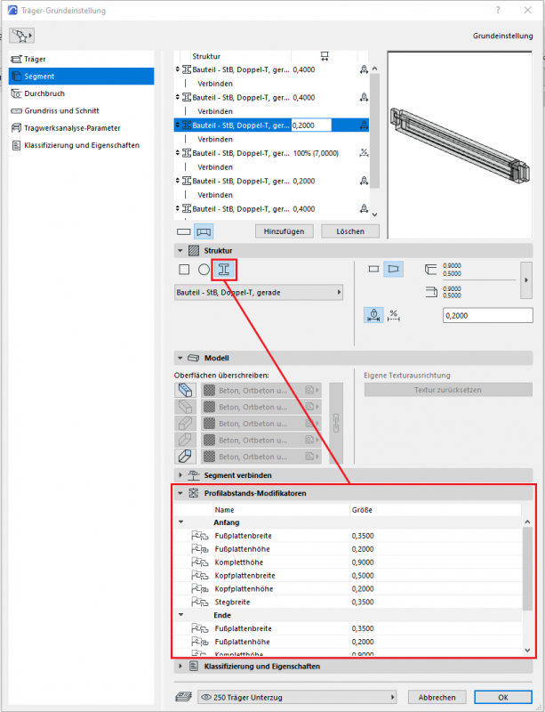 In dem letzten Reiter kann man die einzelnen Segmente klassifizieren und deren Eigenschaften festlegen. Die Struktur der Klassifizierungssysteme des Trägers ist hierarchisch, also der Unterzug ist übergeordnet und die Segmente sind untergeordnet.