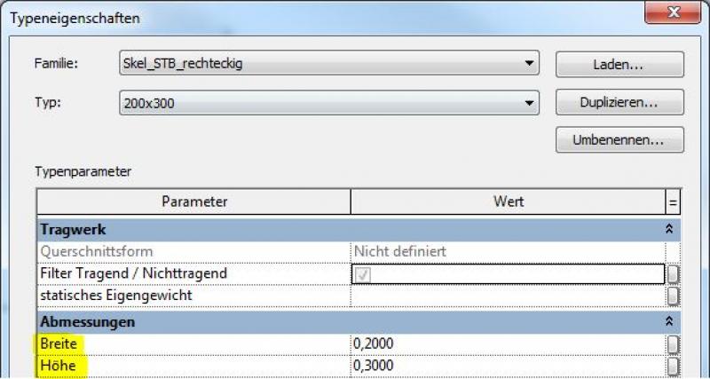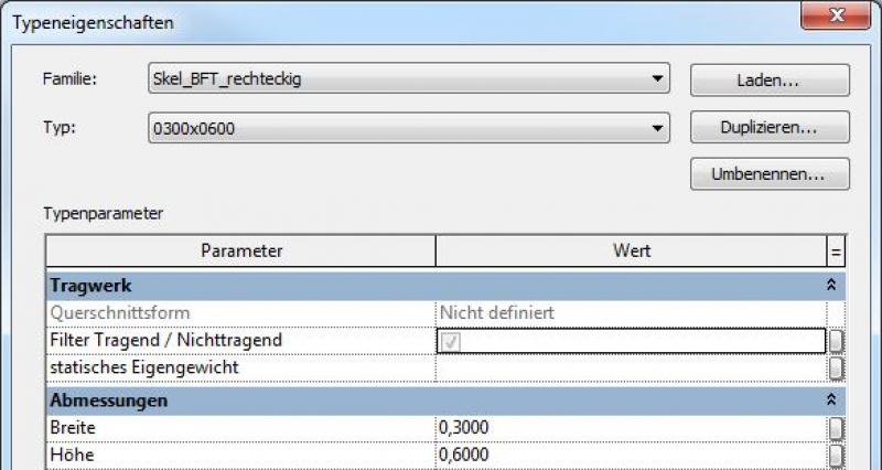 Wird ein weiterer Trägerquerschnitt benötigt, der in der Familie noch nicht enthalten ist, sollte ein neuer Typ mit dem Befehl >Typ bearbeiten und >Duplizieren erzeugt werden. Bei der Neuerstellung eines Trägertyps ist auf eine sinnvolle Benennung zu achten.