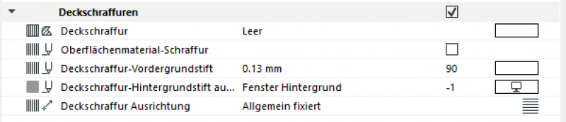 Wenn Sie eine Deckschraffur für den Träger festlegen möchten, aktivieren Sie das Kästchen rechts, um die Einstellungen der Schraffur bearbeiten zu können. Wählen Sie eine aus dem Katalog aus oder verwenden Sie die Schraffur des Oberflächenmaterials. Sie können die Ausrichtung der Deckschraffur ebenfalls definieren, dazu drücken Sie das Symbol rechts in der Reihe.