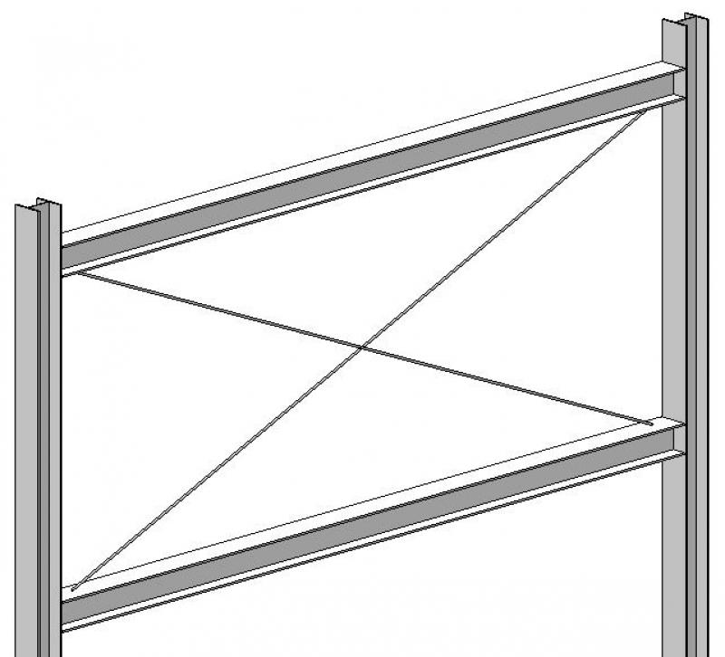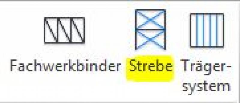 - Strebe: Der Befehl >Ingenierbau >Strebe dient der Erstellung von diagonalen Verstrebungs-Elementen, wie bspw. Zugstäbe in Windverbänden. Vorteil bei der Verwendung dieses Befehls ist, dass die Streben automatisch mit den Trägern und Stützen der Primärkonstruktion verbunden und individuell abgeschnitten werden können. Als Strebe kann jede Familie der Kategorie Skelettbau verwendet werden: