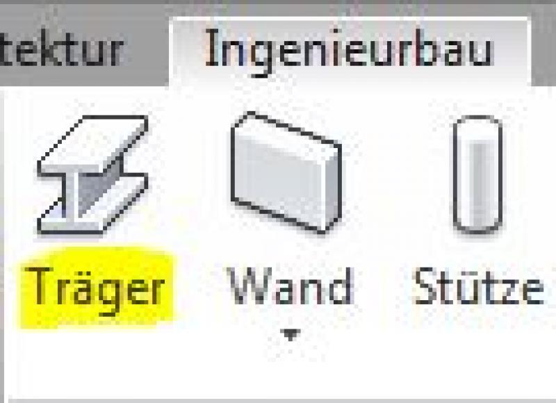 Träger zählen in Revit zur Kategorie Skelettbau und werden mit dem Befehl >Ingenieurbau >Träger erstellt. Bei Trägern handelt es sich generell um tragende Bauteile. Da sie nicht zur Palette der Systemfamilien sonder zu den sogenannten externen (='ladbaren') Familien gehören, müssen sie je nach Bedarf aus dem Revit-Content geladen werden.Befehl: