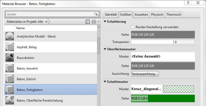 In Revit werden die spezifischen farbigen Darstellungen für Einreichpläne (Genehmigungspläne) im Material definiert (eine Typ-Einstellung für die Farbfüllung im groben Maßstab ist bei den Trägern nicht vorhanden): Farbe im Material:
