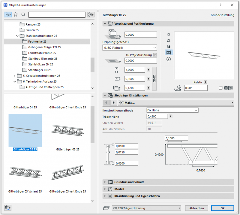 Hintergrund dieses Umstandes ist, dass bei noch nicht definierten Fachwerkträger-Profilen aufgrund eines Software-Automatismus die im Projekt zuletzt verwendete Skelettbau-Familie eingesetzt und im Fall eines großen Stahlbeton-Querschnitts der Fachwerkträger "gesprengt" dargestellt wird.