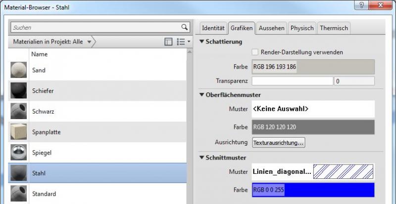 In Revit werden die spezifischen farbigen Darstellungen für Einreichpläne (Genehmigungspläne) im Material definiert (eine Typ-Einstellung für die Farbfüllung im groben Maßstab ist bei den Trägern nicht vorhanden): Farbe im Material:
