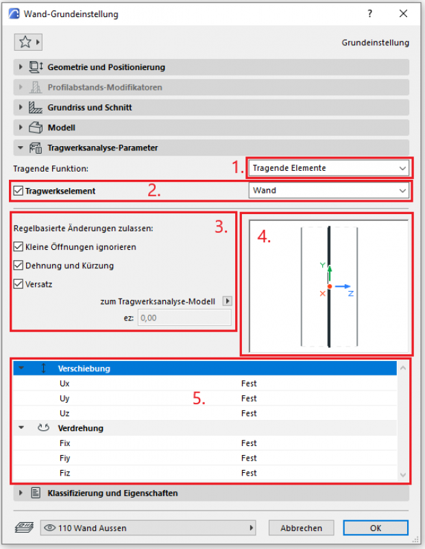 - Als zusätzliche Option kann man mit dem Kästchen festlegen, ob die Wand als Tragwerkselement fungieren soll oder nicht. Im Dropdown-Menü kann man die Art der Tragwerksanalyse-Einheit auswählen.