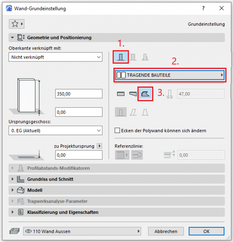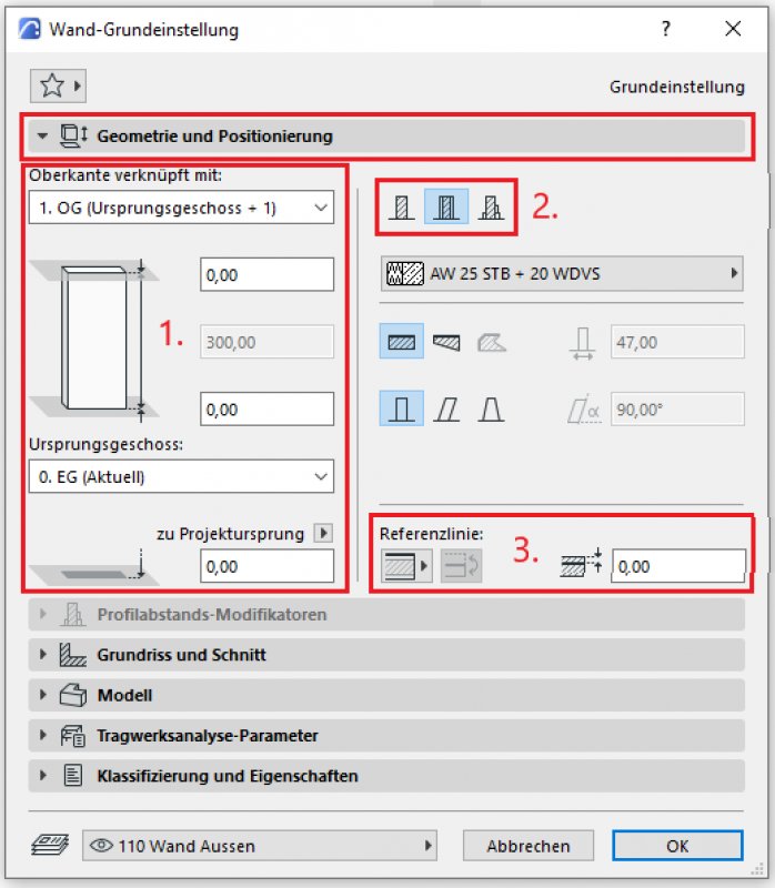 Die 3. Grundeinstellung ist die Wahl der Lager der Referenzlinie einer Wand. Bei tragenden Bauelementen ist dies die Vorderkante des tragenden Baustoffes (z.B. Stahlbeton) oder der Kernschicht im mehrschichtigen Bauteil.