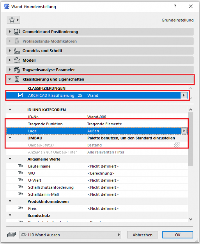 Die 3 Merkmale die auch eine weitere Funktion innerhalb von ArchiCAD erfüllen sind Tragende Funktion, Lage und Umbau Status – diese haben eine Auswirkung auf entweder die Strukturdarstellungs-Methode, die Hüllenfunktion (in weiteren Programmen), oder den Umbaufilter. Alle weiteren Merkmale sind individuell zu wählen, bzw. in Abstimmung mit den Organisationsvorgaben des Projektes zu treffen (bspw. Projekthandbuch oder Organisationshandbuch).