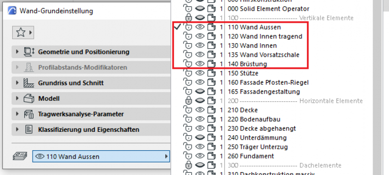Zu Beginn ist die zu verwendende Ebene für die spezifische Wand-Nutzung zu wählen. Diese unterscheiden sich in 110 Wand Aussen, 120 Wand Innen tragend, 130 Wand Innen, 135 Wand Vorsatzschale, 140 Brüstung und nach ihrer Tragstruktur oder speziellen Verwendung:
