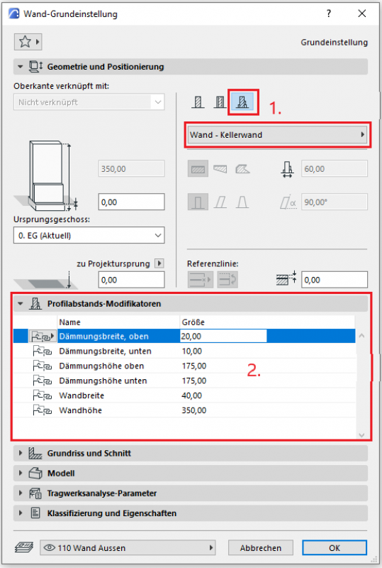 - Wenn die Wand ein komplexes Profil ist und dieses mit Modifikatoren versehen wurde, wird der Reiter Profilabstand-Modifikatoren aktiviert