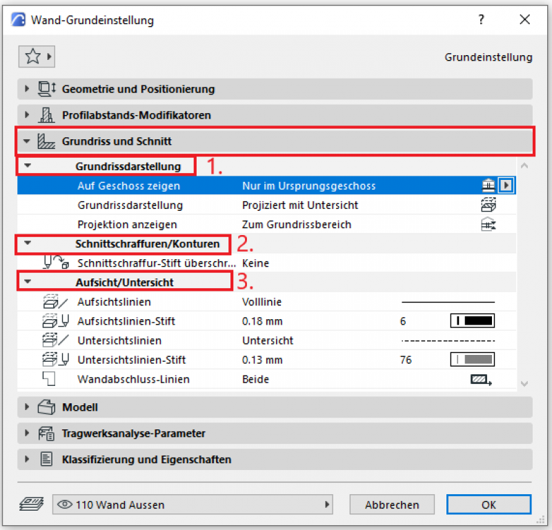 Schnittschraffuren und Konturen sollten nicht in individuellen Wandeinstellungen überschrieben werden – dies sollte immer zentral im Mehrschichtigen Bauteil/Baustoff übergreifend für alle Bauelemente eingestellt werden, oder es wird für spezielle/temporäre Darstellungsänderungen die Option der Grafischen Überschreibungsstile verwendet.