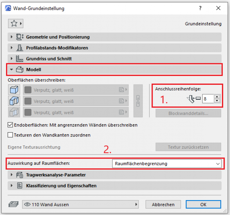 Die 2. Grundeinstellung definiert die Struktur einer Wand (und damit ihre Stärke):