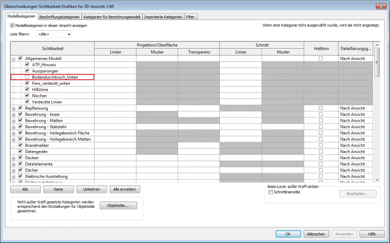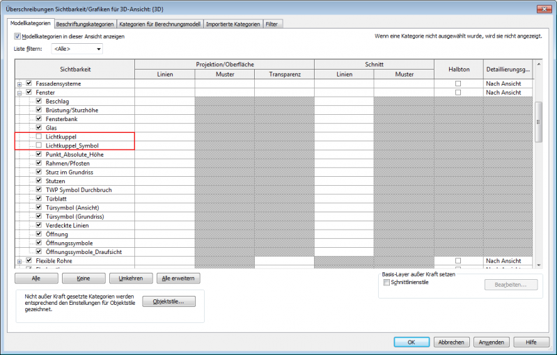 - Sichtbarkeit der in den Lichtkuppeln verschachtelten Durchbruch-Familien steuern mit: die Unterkategorie >Bodendurchbruch_Unten der Hauptkategorie >Allgemeines Modell einschalten