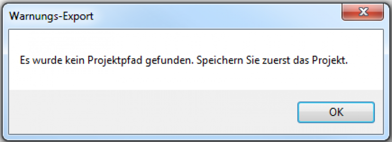 - "Es wurde kein Projektpfad gefunden. Speichern Sie zuerst das Projekt." Wie oben bereits genannt, bedeutet diese Warnung, dass es sich bei dem aktuellen Projekt um ein neues Projekt handelt, welches noch nicht gespeichert wurde. Entsprechend dem Inhalt der Warnung ist das Projekt daher zuerst zu speichern, bevor der Warnungs-Export durchgeführt werden kann.