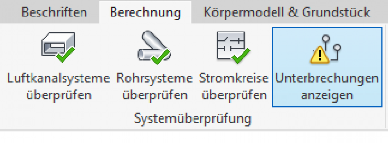 Bevor mit dem Tool gearbeitet werden kann, sind einige Einstellungen zu treffen. Im Reiter Berechnung befindet sich die Toolbox Systemüberprüfung. Hier ist der Button Unterbrechungen anzeigen zu aktivieren, da sonst keine Warnungen, die HKLS oder ELE-Teile betreffen, angezeigt werden.