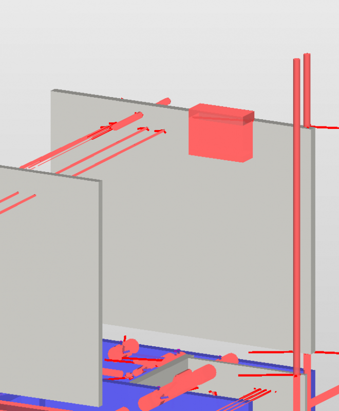 Alle KHLS- und Elektroinstallationen werden gesammelt und die Abstände gegen die Brandschutzklappen werden verglichen. Manchmal werden Elemente, die direkt mit der Brandschutzklappe selbst verbunden sind, als Fehler gemeldet - dies kann ignoriert werden.