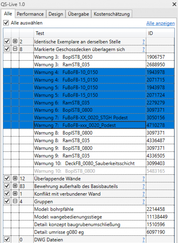 Wenn Bearbeitungsbereiche ausgeschaltet sind und sich in diesen Bauteile befinden, so werden sie nicht vom QS-Live erfasst. Beispiel: Die Warnungsansicht listet in Revit alle Geschoßdecken auf, die Überlappungen haben. Das QS Live konzentriert sich zur besseren Übersicht nur auf die aktuelle Ansicht und kann in dieser nur jene Objekte anzeigen, welche auch in einem geöffneten Bearbeitungsbereich liegen.