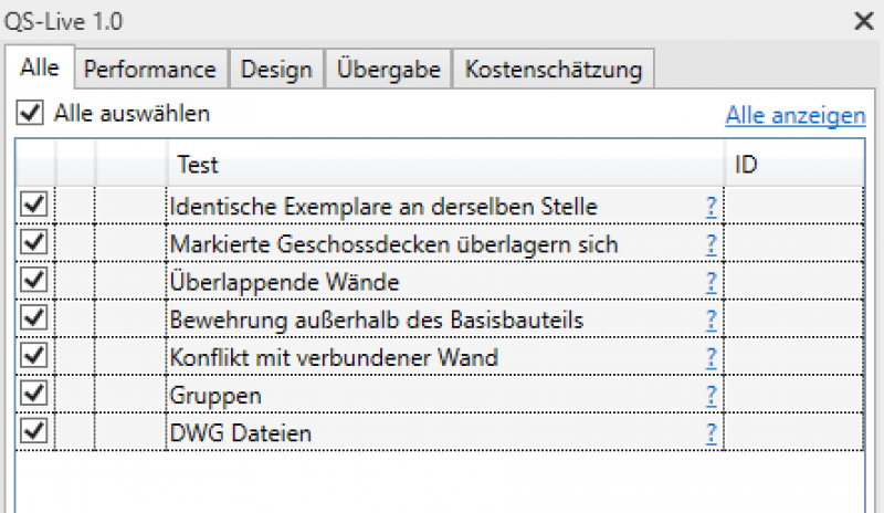 Sie haben die Option, alle Tests durchzuführen - oder nur diejenigen, die Sie auswählen. Selbst bei einer großen Anzahl von Problemen im Modell sammelt das Tool die Informationen rasch.