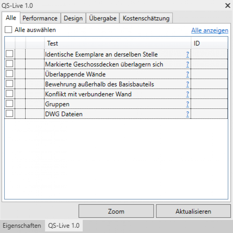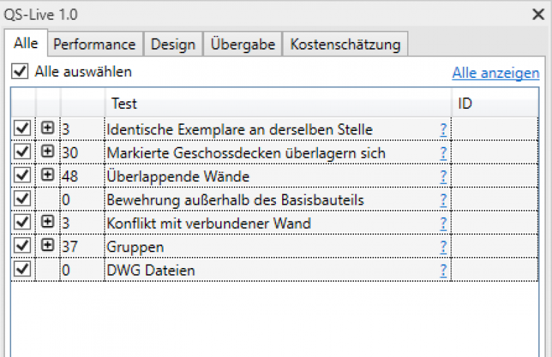 Derzeit sind sieben Prüfregeln für besonders problematische Fehler in Revit hinterlegt. Durch das
