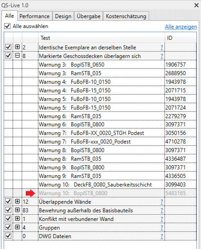 Diese Prüfung basiert auf dem Revit Warnungstyp: Markierte Geschossdecken überlagern sich!