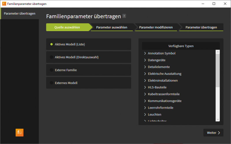- Auswahl aus aktivem Modell oder einer externen Familie bzw. externem Projekt