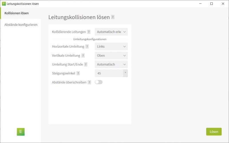 Erkennt alle Kollisionen, die entlang einer ausgewählten Leitung vorkommen und löst die Auskreuzung regelbasiert. Auch hier können Ausweichrichtung, Abstände, Startpunkt und Steigungswinkel frei konfiguriert werden.